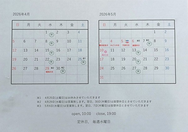 ※4月29日(水曜日)、5月6日(水曜日)は祝日の為、営業日とさせていただきます。それぞれ翌日、4月30日(木曜日)・5月7日(木曜日)を振替休日とさせていただきます